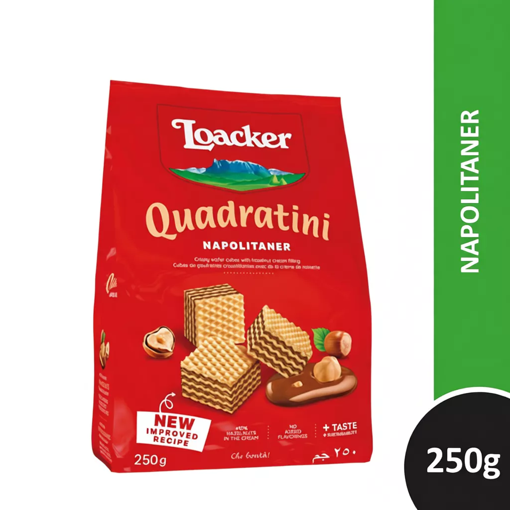 🍫 Loacker Quadratini Wafer is a true delight for chocolate lovers, combining crisp wafer layers with a smooth, rich cream filling for a luxurious taste experience. Each bite delivers a perfect balance of texture and flavor, making these wafers irresistible for any occasion. Premium Ingredients for Superior Quality – Made with high-quality chocolate and Italian hazelnuts – Crafted in the Dolomites for exceptional taste – Available in a 250g pack, perfect for sharing or treating yourself Why You’ll Love Loacker Quadratini: – Crispy wafer layers for a satisfying crunch – Smooth cream filling for a melt-in-your-mouth experience – Multiple flavor options to suit every chocolate craving Enjoy the authentic taste of Loacker Quadratini Wafer, a treat that promises to satisfy your sweet tooth and elevate your snack time!