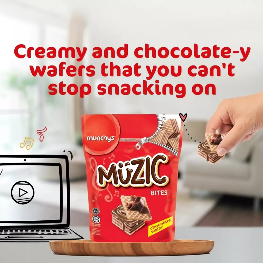 π« Crispy Chocolate Delight: Dive into the irresistible taste of Munchy’s Muzic Wafer Bites! With a crispy exterior and a luscious chocolate cream filling, these treats are perfect for satisfying your sweet cravings.